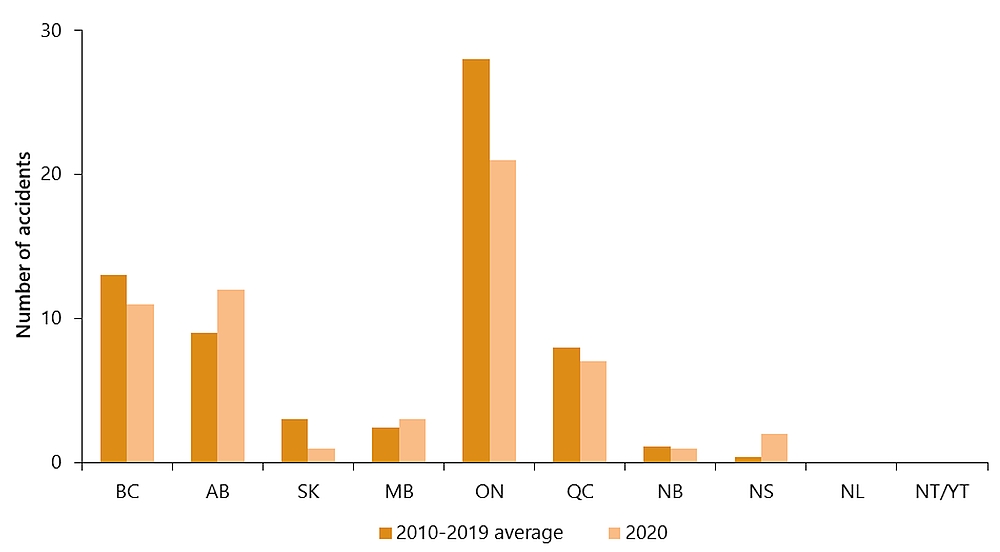 Trespasser accidents (Table 12 and Figure 10) totalled 58 in 2020, up from 56 in 2019 but below the 10‑year average of 65. Ontario accounted for 36% of trespasser accidents, followed by Alberta with 21%, British Columbia with 19%, and Quebec with 12%.