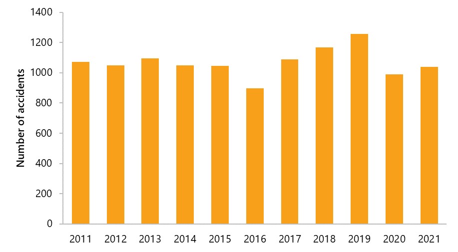 In 2021, 1038 rail accidents were reported to the TSB (Figure 1 and Table 1), up from the 2020 total of 988, but a 3% decrease from the previous 10-year (2011–2020) average of 1071.