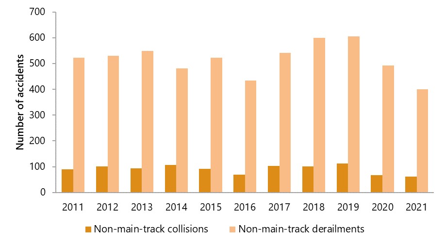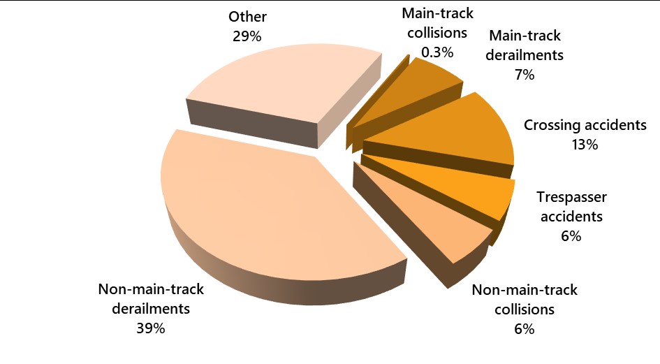 The largest proportion of reported rail accidents (39%) comprised non-main-track derailmentsFootnote 2 (Figure 2 and Table 1). Typically, most non-main-track accidents have low severity, as they occur during switching operations at speeds of less than 10 mph.