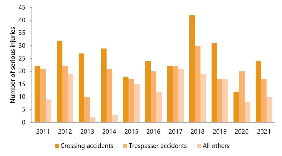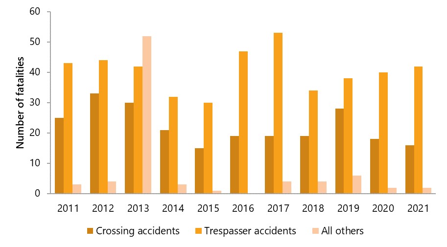 | Year | Crossing accidents | Trespasser accidents | All others |