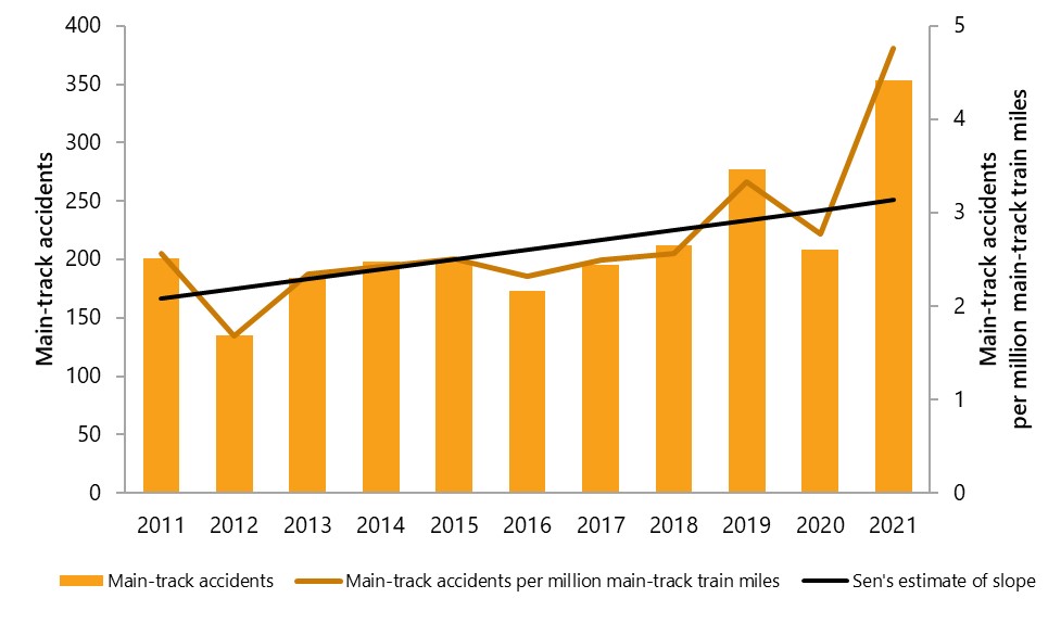 | Year | Main-track accidents | Main-track accidents per million main-track train miles | Sen's estimate of rate slope |