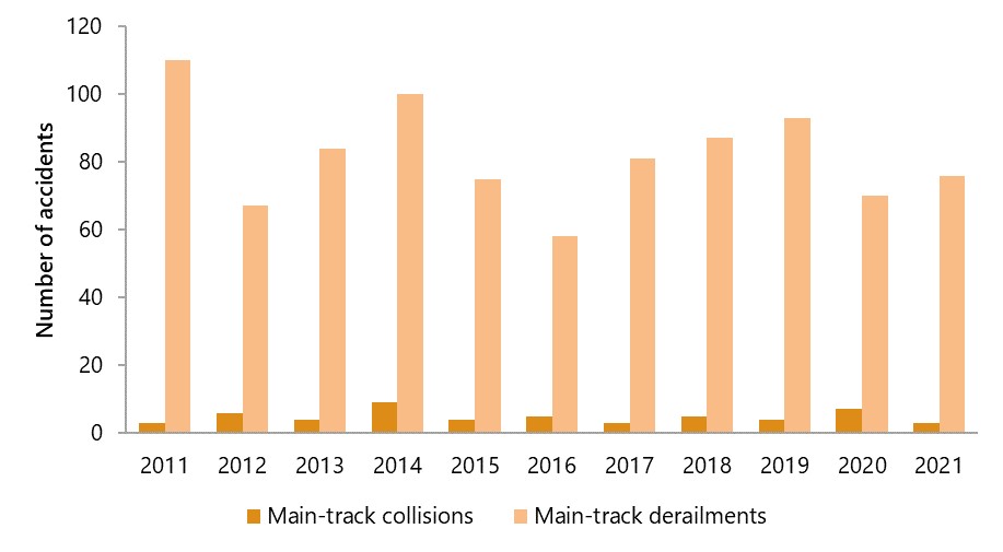 Main-track collisions and derailments have potentially the highest severity of all rail accident types. They can result in substantial damage to property and the environment, and can cause injury or fatality. The risks increase significantly when passenger trains are involved or dangerous goods are released from trains that derail in populated areas.