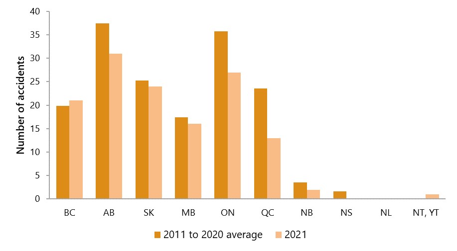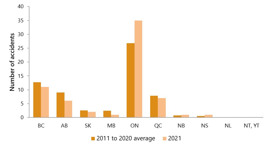 A total of 76 main-track derailments (Table 4) were reported in 2021, an increase from the 2020 total of 70, but 8% below the 10-year average of 83 (Figure 6). Thirty-two percent of the 76 main-track derailments occurred in British Columbia, 22% occurred in Alberta, and 17% occurred in Ontario.