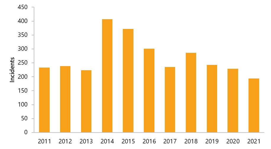 In 2021, 86 accidents involved dangerous goods (Table 1),Footnote 4 up from 82 in 2020 but below the 10-year average of 125. Two accidents resulted in a dangerous goods release in 2021, compared with 3 in 2020, and the 10-year average of 4.