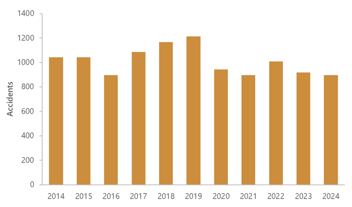 The 896 accidents represent a 2% decrease from 2023 and a 12% decrease from the 10-year average of 1021.