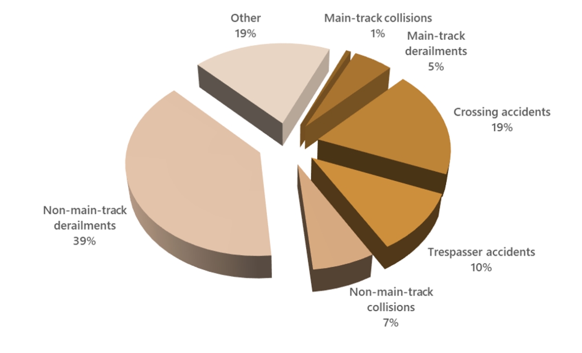 The largest proportion of reported rail accidents comprised non-main-track derailments“Derailment” means any instance where one or more wheels of rolling stock have come off the normal running surface of the rail. (39%) (Figure 2 and Table 1). Typically, most non-main-track derailment accidents are minor, occurring during switching operations at speeds of less than 10 mph.