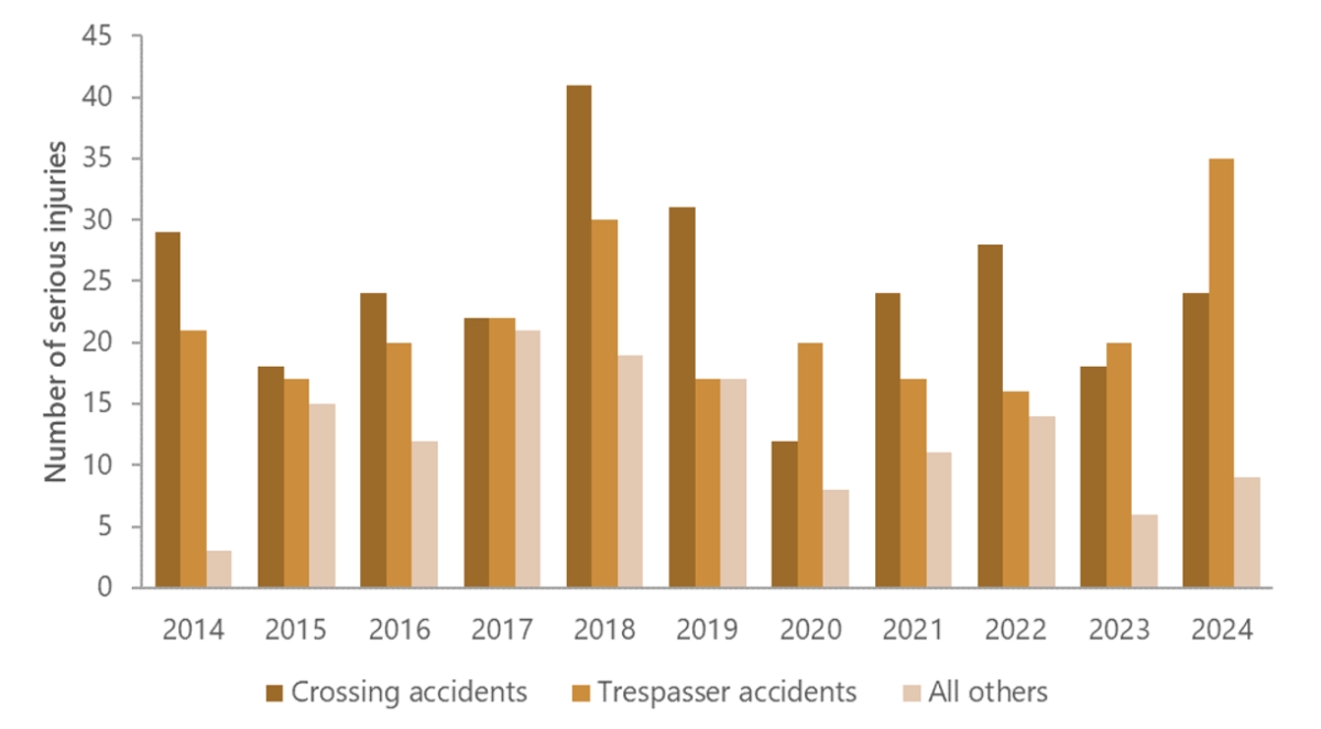 A total of 68 serious injuriesSee the Definitions section. resulted from rail occurrences in 2024 (Figure 4 and Table 1), up from 44 in 2023 and above the 10-year average of 57. Crossing accidentsA crossing accident occurs when railway rolling stock is involved in a grade-crossing collision with a motor vehicle or with a pedestrian, resulting in death, serious injury or property damage. resulted in 24 serious injuries, up from 18 in 2023 but below the 10-year average of 25. Serious injuries to trespassers totalled 35 in 2024, up from 20 last year and above the 10-year average of 20. Six railway employees were seriously injured in 2024, up from 3 in 2023 but below the 10-year average of 11 (Table 2).