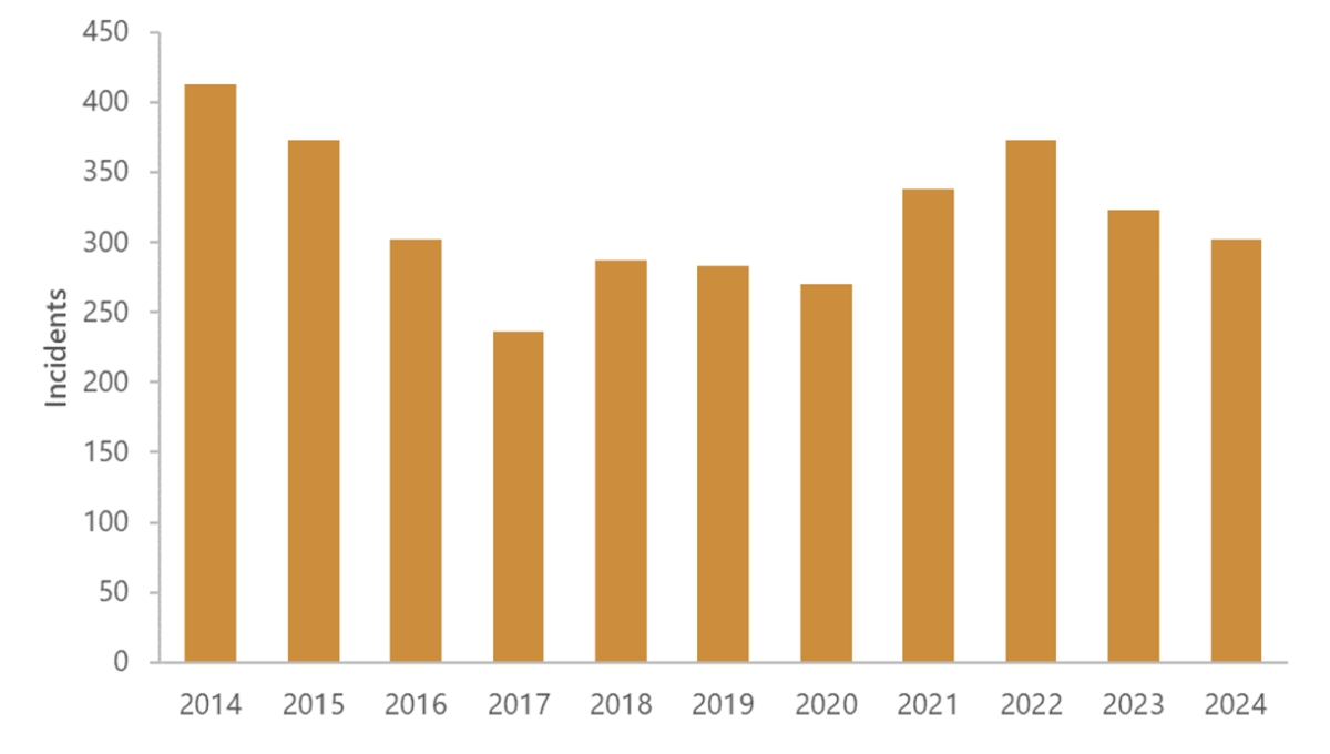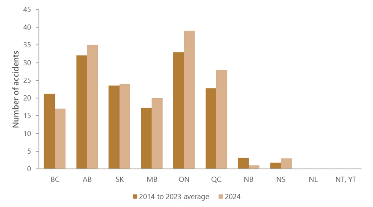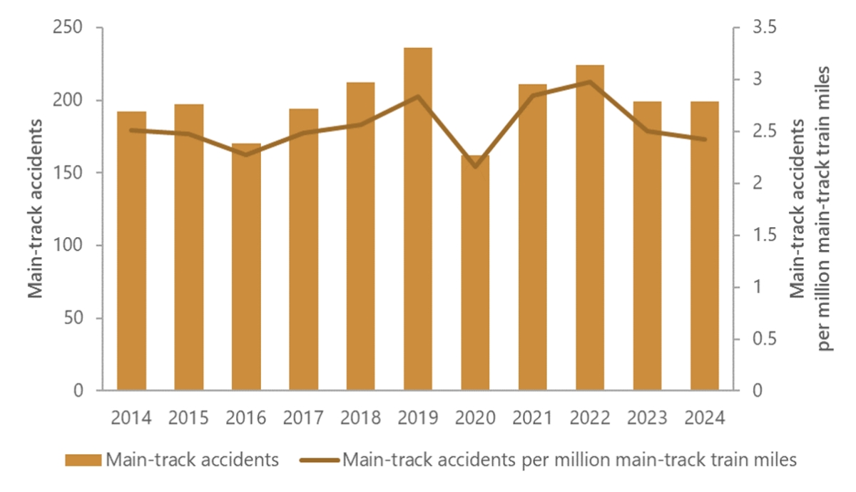 The number of main-track accidentsAccidents that occur on the main track or spurs (not including crossing accidents, trespasser accidents, and non-main-track collisions and derailments) are combined in order to match the figures used in the activity data, which is the total of main-track and spur (i.e., non-yard) million train miles. totalled 199 in 2024 (Figure 5 and Table 1), unchanged from 2023 and approximately equal to the 10-year average of 200. Rail activityTransport Canada, Rail Safety Directorate (email dated 25 March 2025). on main track (i.e., non-yard activity) increased by 3% from the previous year. The main-track accident rate in 2024 was 2.4 accidents per million main-track train miles, down from 2.5 in 2023 and below the 10-year average of 2.6.