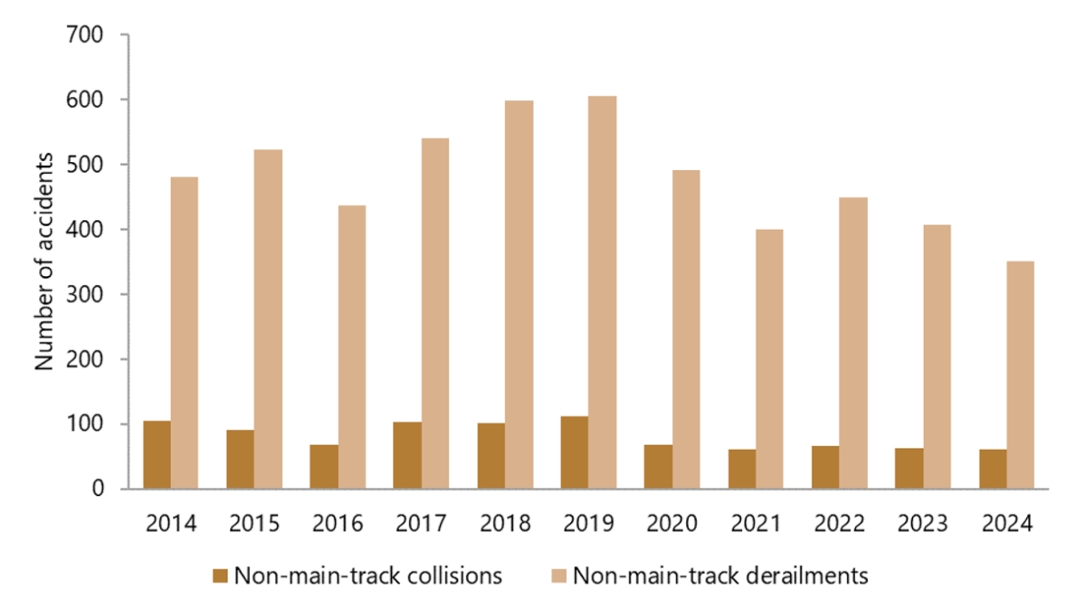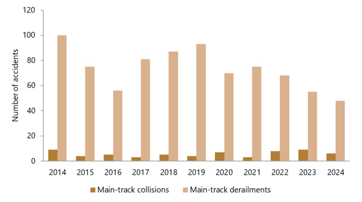 The proportion of accidents that were main-track derailments in 2024 (5%) was down from the previous year (6%) and below the 10-year average (7%).