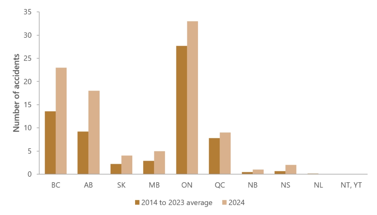 Among all rail transportation accidents, 87 involved dangerous goods. This is the same as the number reported in 2023 and is lower than the 10-year average of 115. Three accidents in 2024 resulted in dangerous goods being released.