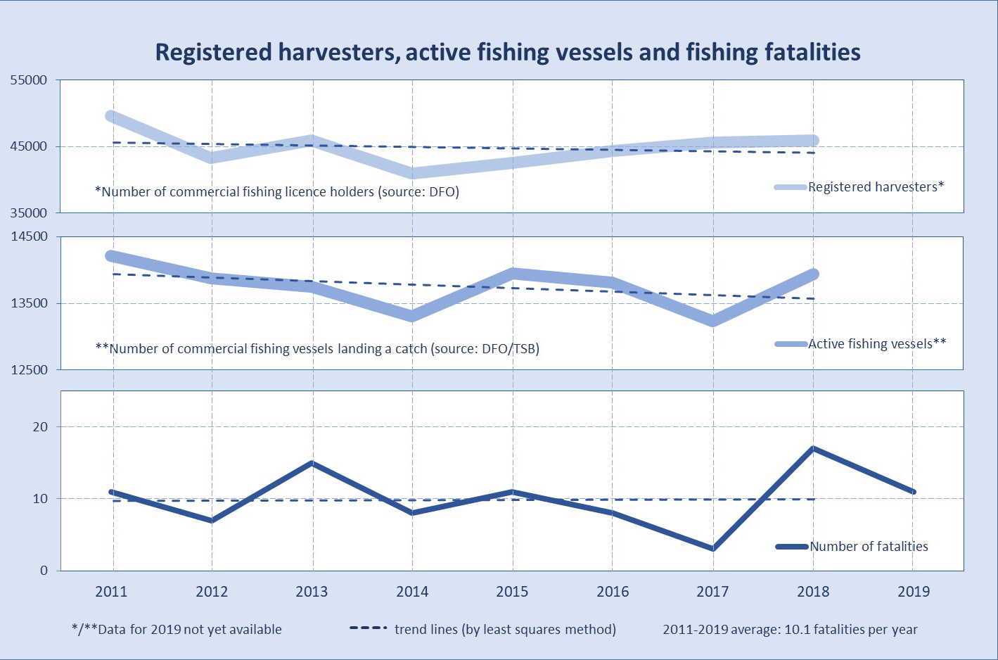 Since the publication of the 2018 TSB Watchlist, there have been an additional 28 fatalities related to commercial fishing in Canada. The number of fish harvesters that lose their lives annually has not decreased, and continues to average about 10 fatalities per year, despite a slight reduction in the number of registered fish harvesters and active fishing vessels over the same period. There are currently approximately 45 000 fish harvesters in Canada, making harvesting marine resources one of the most hazardous occupations in the country. The vast majority, if not all, of these fatalities are preventable.