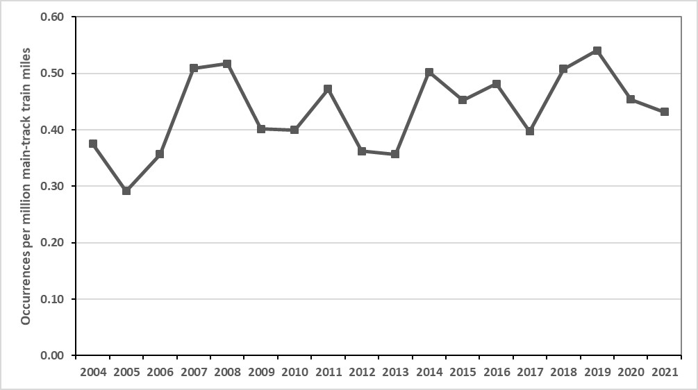 | Year | Occurrences | Occurrences per million main-track train miles |