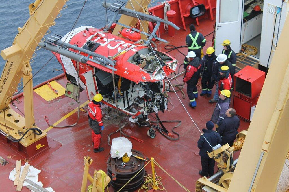 À 17 h 38, le CCG364 a informé le NGCC Amundsen qu'il prévoyait arriver dans 10 minutes. Comme l'hélicoptère n'était toujours pas de retour à 18 h 5, on a vérifié sa position au moyen du système de suivi des vols, qui indiquait que l'hélicoptère se trouvait à 3,2 milles marins du navire. Dès 18 h 18, l'équipage du NGCC Amundsen a tenté à plusieurs reprises de communiquer par radio avec le pilote, mais sans succès. À 18 h 24, le navire a fait route vers la dernière position de l'hélicoptère indiquée par le système de suivi des vols. À 18 h 47, on a trouvé des débris. L'embarcation rapide de sauvetage du navire a été mise à l'eau pour tirer les 3 occupants des eaux; aucun d'entre eux n'a survécu. L'hélicoptère a coulé par 458 m d'eau. L'accident est survenu en plein jour. Le système satellite n'a reçu aucun signal de l'émetteur de localisation d'urgence de 406 MHz.