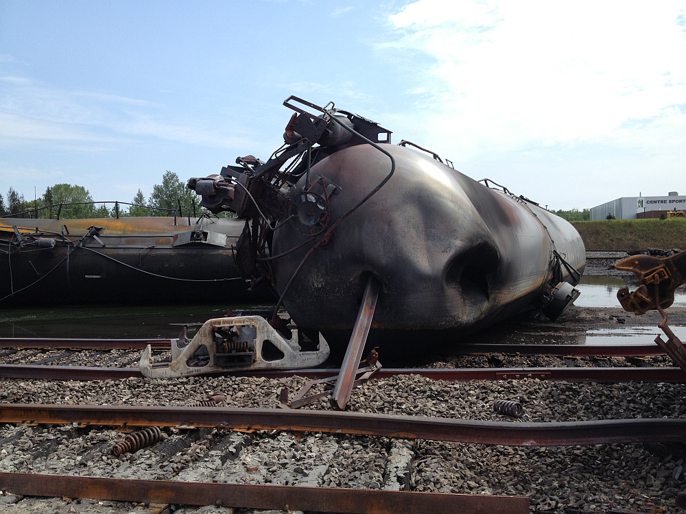 Égueulé d'un wagon-citerne DOT-111 de l'accident survenu le 6 juillet 2013 à Lac-Mégantic (Québec).