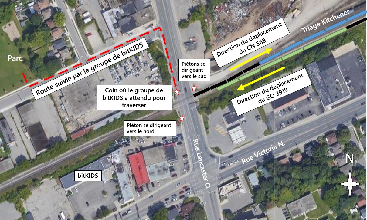 Vers 14 h 44Note de bas de page 1 le 13 novembre 2019, alors qu’il rentrait d’un parc voisin pour se rendre à sa clinique de la rue Victoria Nord à Kitchener (Ontario), un groupe de piétons (6 thérapeutes adultes et 5 clients enfants) de bitKIDS Behaviour Consulting (bitKIDS) a rencontré des dispositifs d’avertissement de passage à niveau (DAPN) automatiques activés au passage à niveau public de la rue Lancaster Ouest. Les DAPN activés étaient constitués de feux clignotants, de cloches ainsi que de barrières qui s’étendaient de chaque côté de la chaussée, mais pas sur les passages pour piétons.