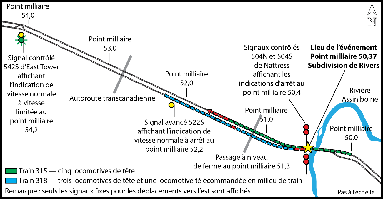 Le 3 janvier 2019, vers 6 h 10, heure normale du CentreNote de bas de page 1, près de Rivers (Manitoba), le train de marchandises M31851-01 (train 318) exploité en direction est par la Compagnie des chemins de fer nationaux du Canada (CN) a commencé à suivre le train Q11651-30 (train 116) exploité en direction est par le CN sur la subdivision de Rivers du CN. Les deux trains avaient pour destination Winnipeg (Manitoba). Le train 318 était un train cléNote de bas de page 2 exploité sur un itinéraire cléNote de bas de page 3, tels que définis dans le Règlement relatif aux trains et aux itinéraires clés approuvé par Transports Canada (TC).