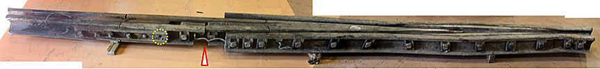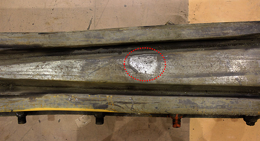 Les 2 rails montrés dans la figure 8 provenaient d’un seul aiguillage ordinaire à gauche de 22 pieds. Les deux rails et le mécanisme de manœuvre ont été gravement endommagés au cours du déraillement. Les extrémités des aiguilles ne présentaient rien de particulier, si ce n’est un léger détachement de la selle sur la pointe gauche (figure 10). L’usure du rail respectait les limites prescrites pour un rail RE de 115 livres (se reporter aux colonnes 5 à 7 du tableau 1 et au paragraphe 2.2).