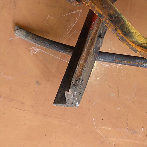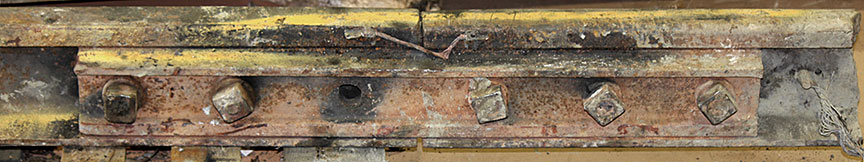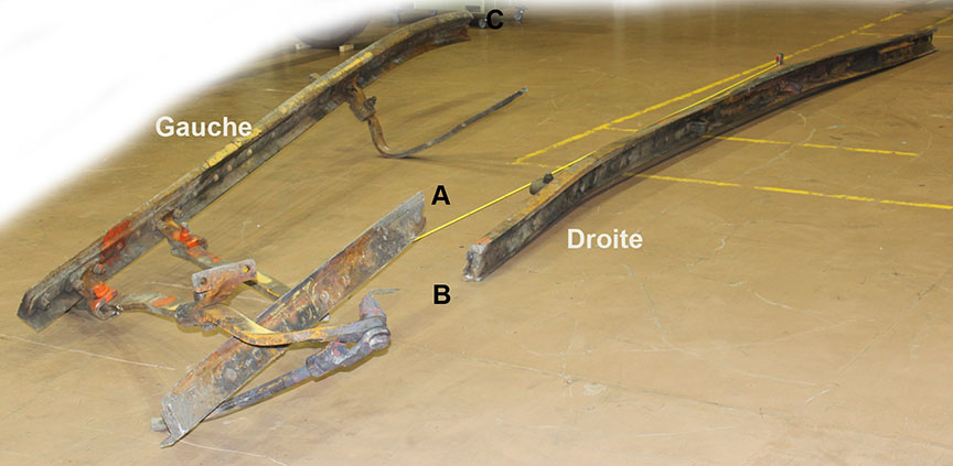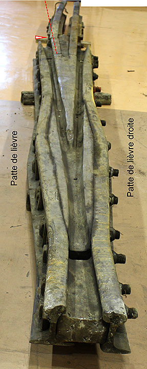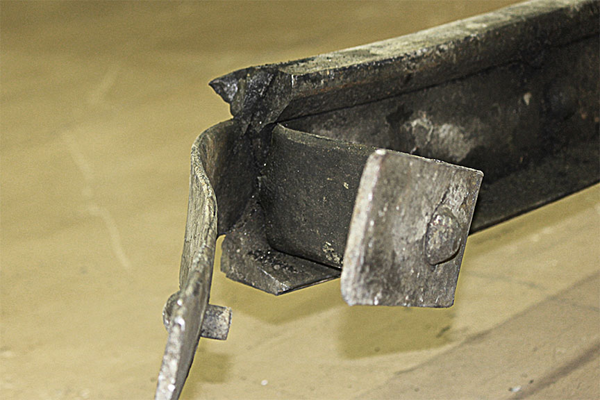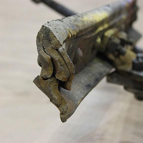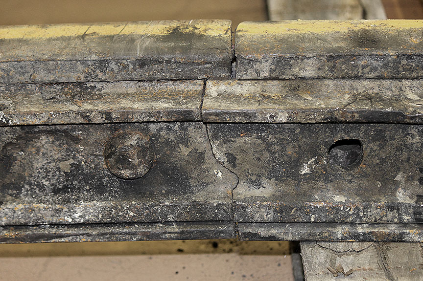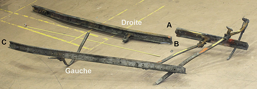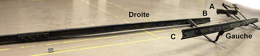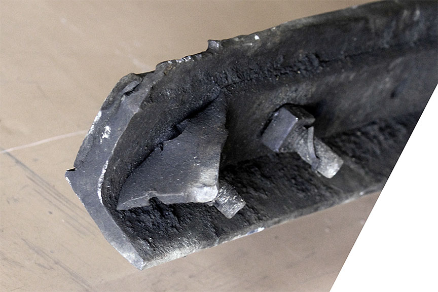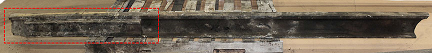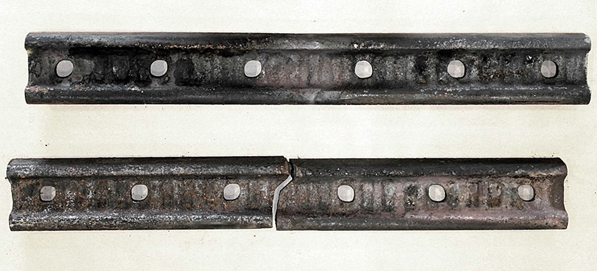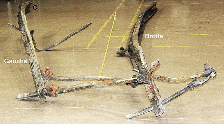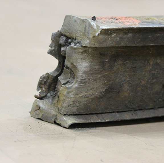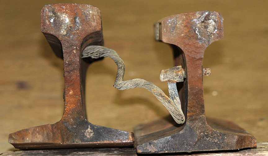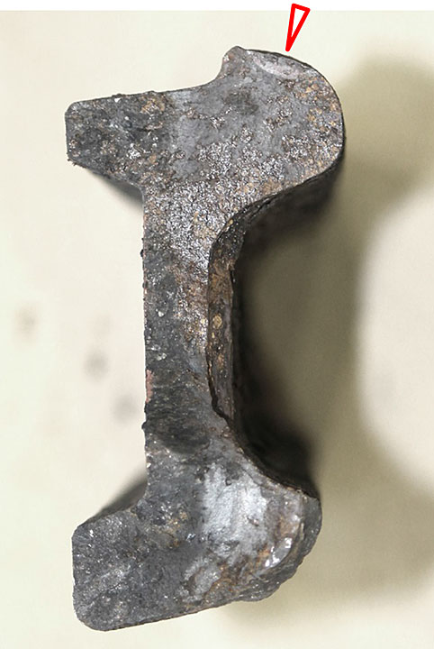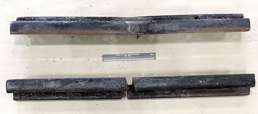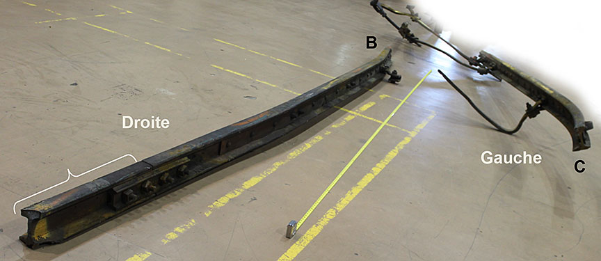 Sur le site de l’événement, on a découpé les rails du cœur de croisement raccordés aux rails de prolongement de pointe pour en faciliter le transport au Laboratoire d’ingénierie du BST (la partie inférieure de la figure 1d montre les extrémités coupées).