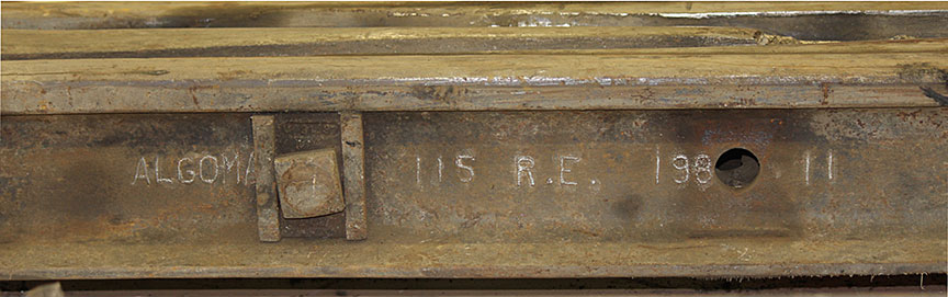 La figure 14 montre les deux morceaux de rail joints, comme ils se présentaient à la réception. Les deux morceaux mesuraient respectivement environ 8 pieds et 2 pieds de longueur. Le plus long portait les marques d’identification ALGOMA C.C. 115 LBS RE 1983; le plus court n’en portait aucune. L’éclisse du côté intérieur portait le marquage ALGOMA C.C. 115 LBS RE 1987. Le seul marquage discernable sur l’éclisse du côté extérieur se lisait ALGOMA … 1975 … PAT 1947.
