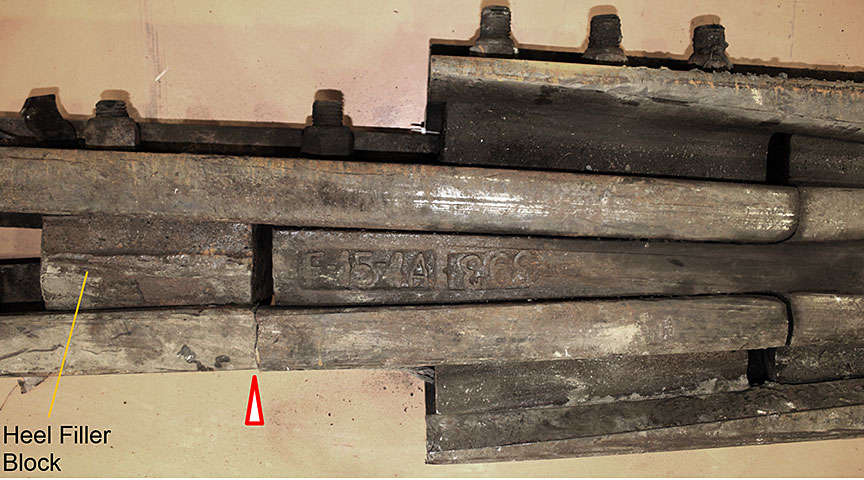 Pour résumer l’examen : toutes les ruptures de rail et la déformation des éclisses sont le résultat d’une contrainte excessive. Le cœur avait plus de 30 ans, mais on n’a observé ni usure excessive, ni autres conditions préexistantes qui auraient pu provoquer le déraillement. Par conséquent, la conclusion s’impose : les ruptures et la déformation observées sur les éléments du cœur ont probablement été causées par le déraillement.