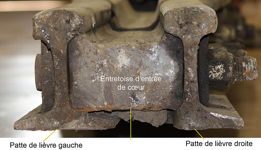 Les dommages observés sur le cœur de croisement, les lames d’aiguillage et les éclisses provenaient sans doute du déraillement plutôt que d’en être la cause.