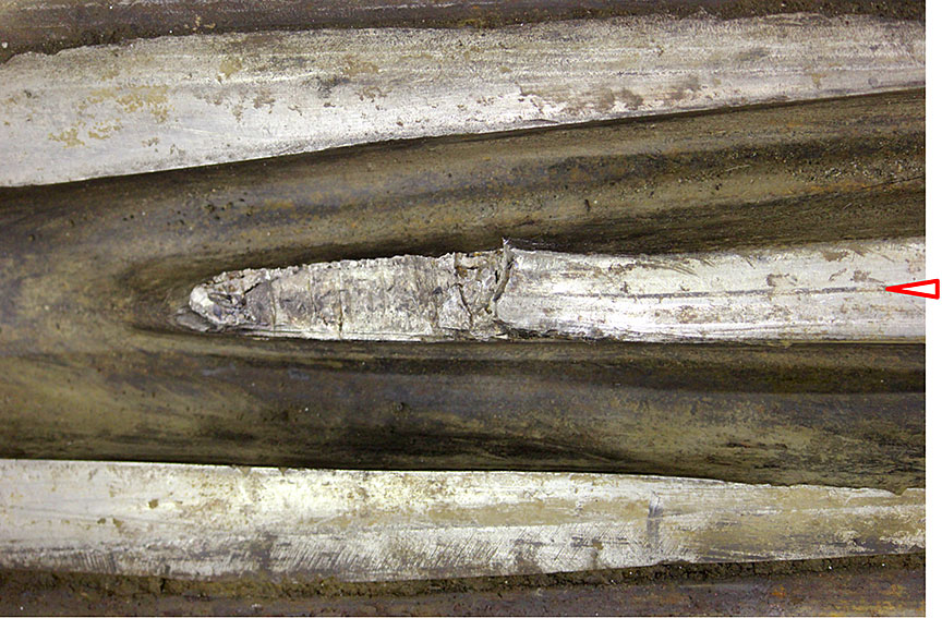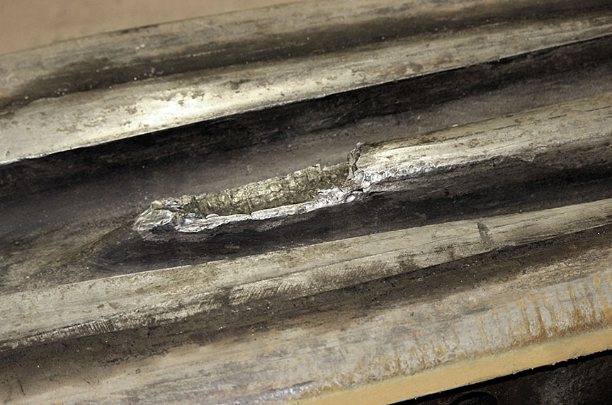 Comme on l’a mentionné dans le paragraphe précédent, la pointe du cœur avait probablement été réparée par soudage. De telles réparations sont permises et il faudrait retirer ou réparer tout cœur dont l’usure atteint 0,5 pouce à partir de son sommet Note de bas de page 3. La partie manquante de la pointe de cœur avait une épaisseur approximative de 0,5 pouce, ce qui indique que la pointe avait été réparée parce que son usure approchait de la limite. Il y avait aussi des signes de réparations en d’autres endroits du cœur; on en voit un exemple dans la figure 7.