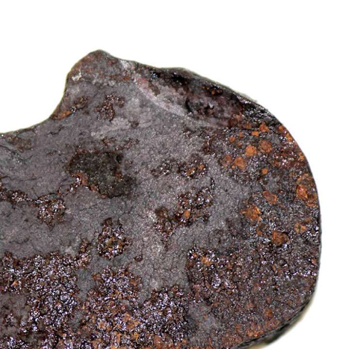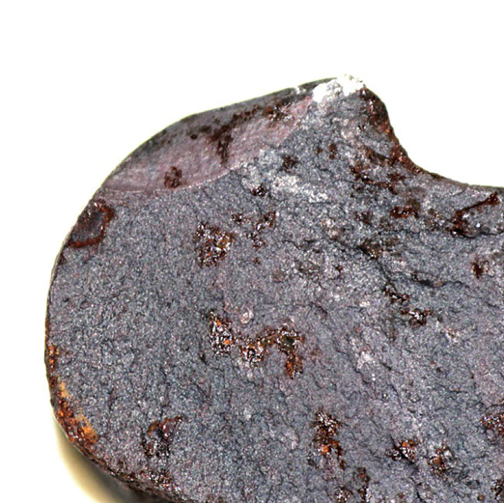 Le rail gauche de prolongement de pointe s’était rompu entre l’extrémité sortie de cœur de la partie centrale du cœur et l’entretoise de sortie de cœur (cet emplacement est indiqué par des flèches dans les figures 1b, figures 1c et figures 2a). La figure 4 montre un gros plan des surfaces de contact de rupture pour ce rail. Ces surfaces de rupture présentaient elles aussi une texture rugueuse caractéristique des ruptures dues à une contrainte excessive et avaient été endommagées par le feu. La fissure dans la partie amincie de l’entretoise de sortie de cœur (indiquée par une flèche dans la figure 2c) est survenue probablement en même temps que la rupture du rail de prolongement de pointe. Selon toute vraisemblance, c’est une force exercée sur le rail depuis le côté gauche qui a provoqué ces ruptures. Cette force a eu pour effet de pousser vers l’intérieur, en direction du rail de droite, le rail gauche de prolongement de pointe le long du rail de raccordement du cœur (voir les figures 1c et 1d, où l’orientation normale des rails de gauche est indiquée par des lignes pointillées rouges). La force en question a également déformé les éclisses reliant les rails de prolongement de pointe et ceux du cœur (figure 5). Remarquez l’absence d’un boulon, dont le trou correspondant est encerclé dans la figure 1a. Tous les trous des boulons d’éclisse et de rail présentaient un degré d’usure et de corrosion similaire, et il n’y avait aucun signe que certains avaient été exposés aux éléments plus longtemps que les autres. Il est donc probable que le boulon manquant s’est cassé et perdu au cours du présent événement.