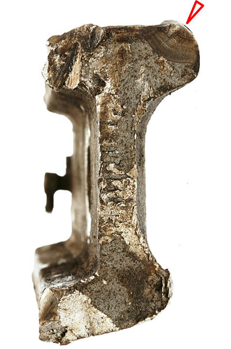 L’usure du champignon des deux rails était limitée (se reporter aux colonnes 8 et 9 du tableau 1). Les ruptures des deux rails étaient imputables à une contrainte excessive (figure 15).