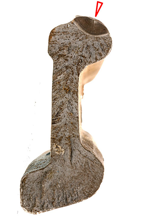 La figure 6 montre un gros plan de la pointe du cœur, qui a été endommagée – la partie manquante mesurait environ 5 pouces de longueur et 0,5 pouce d’épaisseur. La partie horizontale de la surface de séparation présente un aspect onduleux caractéristique du joint entre une zone réparée par soudage et le matériau de base. Cette constatation suggère que la pointe de cœur avait été précédemment réparée par soudage. La portion approximativement verticale de la surface de séparation (à environ 5 pouces de l’extrémité de la pointe) avait des caractéristiques typiques d’une rupture due à une contrainte excessive. On estime probable que le morceau manquant s’est détaché au cours du présent événement. Si la séparation s’était produite avant le déraillement, on s’attendrait à trouver à sa surface de multiples marques de roue. Il avait aussi des marques de contact des boudins de roue sur le bord gauche de la partie endommagée de la pointe (figure 6), mais pas de marques précises ailleurs. Remarquer aussi une marque faite par une jante de roue sur le sommet de la surface supérieure restante de la pointe (représentée par une flèche dans la figure 6a). Il n’y avait pas d’entaille sur le bord de la surface verticale de rupture correspondant à cette marque de roue, ce qui suggère que celle-ci a été faite au moment où le morceau manquant de la pointe était encore en place.