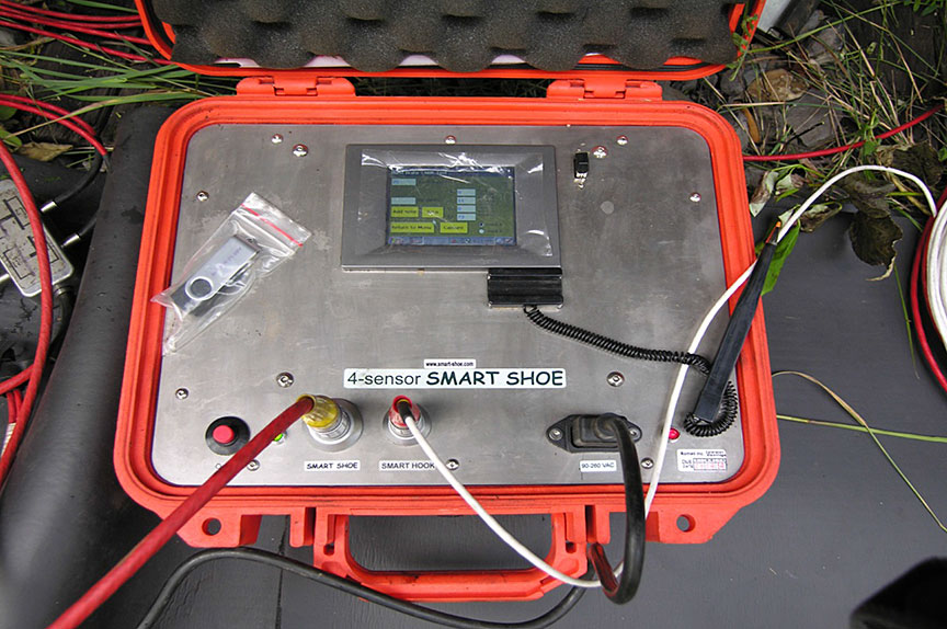 Une trousse d’essai Smart Shoe comprend 4 ou 8 capteurs qui remplacent les semelles de frein et mesurent la force de la pression (effort aux semelles de frein) exercée sur la table de roulement des roues par le piston du cylindre du frein à air ou la chaîne du frein à main. Les capteurs sont reliés à un amplificateur et à un moniteur intégrés (figure 9) qui captent les efforts à la semelle de frein s’exerçant sur chaque roue. On additionne les relevés pour calculer l’effort total aux semelles de frein et le coefficient de freinage sur le véhicule testé.
