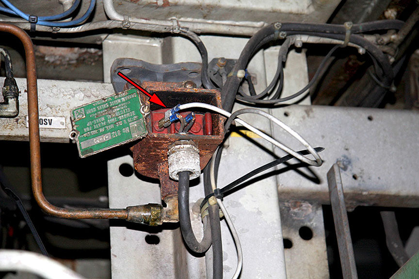 L’examen de la locomotive 5023 (figure 6) a montré que l’OSV était alimentée électriquement en conformité avec la configuration initiale de fabrication, c.-à-d., par le fil étiqueté « 80PC » raccordé à l’extérieur de la boîte de jonction. Le RSC était directement raccordé au côté sous tension de la batterie. Le fil du circuit d’essai du frein était raccordé électriquement à la même borne que le signal de commande du RSC, mais en était séparé physiquement (figure 7); il n’y avait pas de boîtier protecteur autour des bornes. Le sectionneur de l’OSV était fermé, tel qu’on l’avait trouvé, mais il a été ouvert pour les essais.
