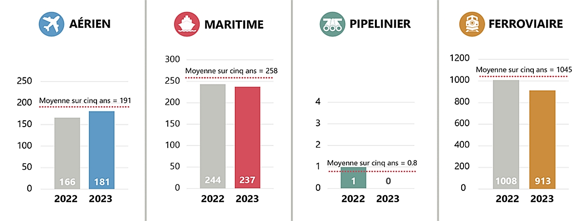 En 2023, un total de 1234 événements ferroviaires (accidents et incidents) ont été signalés au BST, une diminution de 11 % par rapport à l’année précédente (1382).