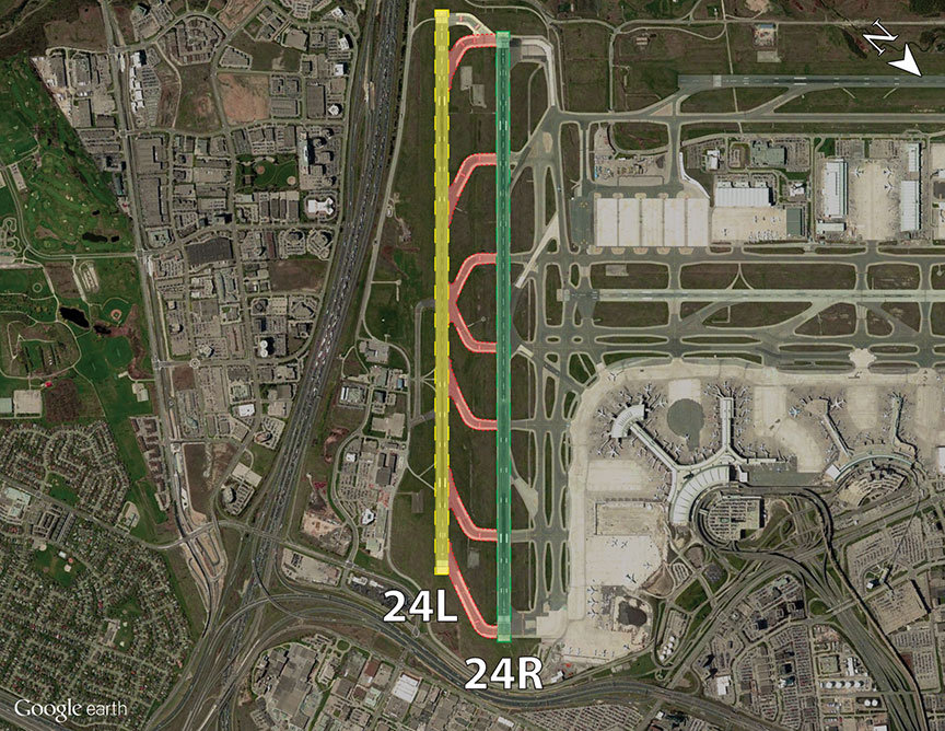 Les voies de sortie rapide au complexe sud comportent plusieurs caractéristiques qui sont différentes des voies de sortie rapide de presque tous les autres grands aéroports en Amérique du Nord. Par exemple, les sorties mènent directement à la piste parallèle « intérieure », les lignes d'attente se trouvent immédiatement à la sortie d'une courbe et, notamment, elles sont plus éloignées de la zone protégée de la piste. Ces caractéristiques inhabituelles font en sorte que les lignes d'attente ne se trouvent pas là où les équipages de conduite s'attendent à les voir. En outre, les équipages qui ne connaissent pas bien ces sorties et la vitesse de roulage relativement élevée des avions à réaction régionaux diminuent la probabilité que les équipages reconnaissent les lignes à temps et s'arrêtent avant de faire une incursion sur la piste.