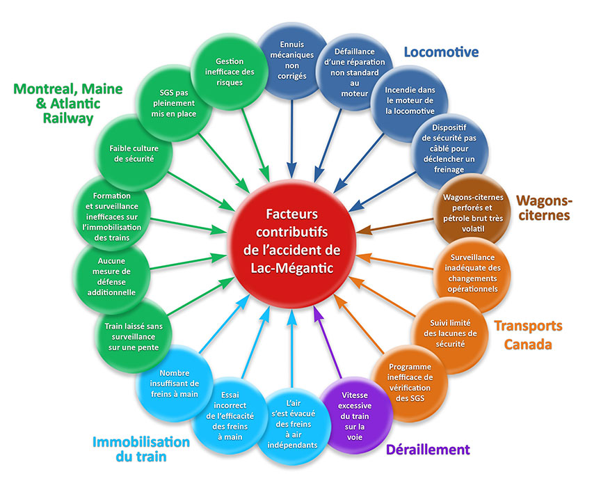 Les enquêtes menées par le Bureau de la sécurité des transports du Canada (BST) sont complexes, et un accident n’est jamais causé par un seul facteur. L’accident ferroviaire de juillet 2013 à Lac-Mégantic (Québec) ne fait pas exception. L’accident résultait de nombreux facteurs, qui sont expliqués dans les 18 faits établis quant aux causes et facteurs contributifs. De plus, l’enquête a aussi cerné 16 faits établis quant aux risques ainsi que 6 autres faits établis.