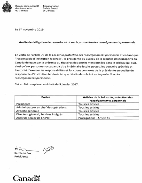 Une délégation de pouvoirs a été établie, comme l’exige la Loi. Aux fins de la Loi sur la protection des renseignements personnels, la personne « responsable d’institution fédérale », en vertu de l’article 3, est la présidente du BST. La présidente a délégué aux personnes occupant les postes d’administrateur en chef des opérations, d’avocate générale, de directeur général des Services intégrés et d’analyste principal de l’AIPRP les pouvoirs jugés nécessaires pour l’administration efficace de la Loi. Ces employés s’assurent que le BST s’acquitte de toutes ses obligations de façon équitable et uniforme. La délégation de pouvoirs a été mise à jour en novembre 2019 et reste inchangée. Un exemplaire de l’arrêté de délégation se trouve à l’annexe A.