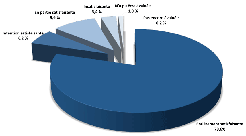 Le Bureau a accordé la cote intention satisfaisante à 6,2 % des réponses. Cela indique que les agents de changement avaient pris ou avaient l'intention de prendre des mesures qui, une fois pleinement mises en œuvre, devraient corriger en grande partie les lacunes constatées. La cote en partie satisfaisante a été attribuée dans 9,6 % des cas, ce qui signifie que les agents de changement avaient pris ou avaient l'intention de prendre des mesures qui ne pourraient que partiellement remédier aux lacunes. Le Bureau a évalué 3,4 % des réponses comme étant insatisfaisantes, parce que les agents de changement n'avaient pas pris – ou n'avaient pas l'intention de prendre – des mesures en vue de corriger les lacunes constatées, ou parce qu'ils avaient mis trop de temps à mettre en œuvre les mesures prévues. Dans les autres cas, le Bureau n'avait pas reçu suffisamment d'information pour être en mesure d'évaluer les réponses, ou les recommandations étaient trop récentes pour qu'on ait pu procéder à une évaluation.