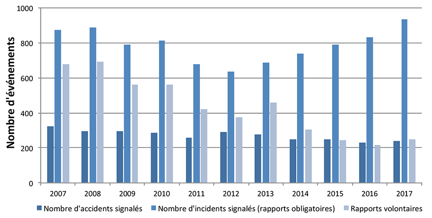 Après une tendance constamment à la baisse depuis 2013, le nombre total d'événements signalés a augmenté en 2017, malgré des améliorations dans certains secteurs.Note de bas de page 1 En 2017, 1614 accidents et 2210 incidents ont été déclarés conformément à la réglementation du BST sur la déclaration obligatoire d'événements (figure 2).Note de bas de page 2