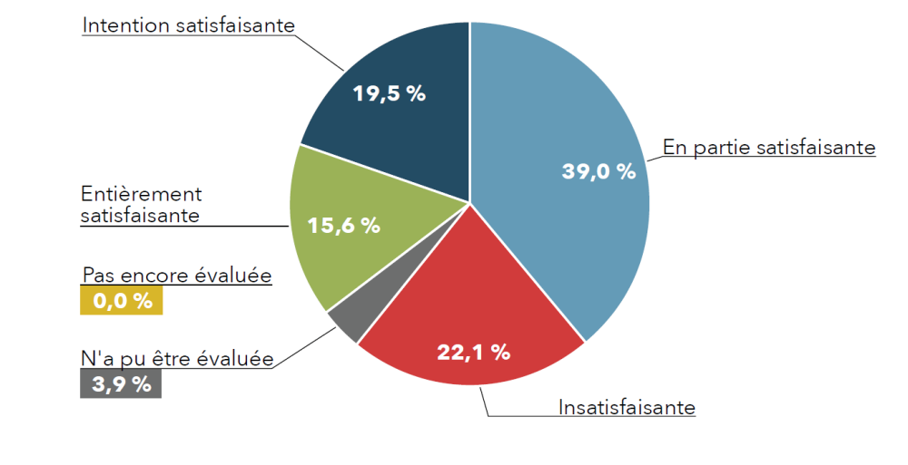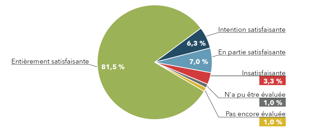 Le Bureau a émis 604 recommandations depuis 1990. À la fin de 2018-2019, il avait accordé sa plus haute cote, attention entièrement satisfaisante, à 81,5 % des réponses à ces recommandations (en hausse par rapport à 79,6 % à la fin de 2017-2018). Cela signifie que les intervenants, y compris Transports Canada, avaient agi de manière à atténuer considérablement les lacunes de sécurité que le Bureau avait soulevées dans ses recommandations.