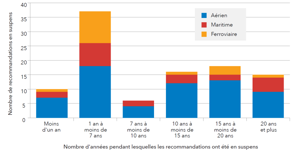 En date du 31 mars 2019, il y avait 102 recommandations en suspens, dont un peu moins de la moitié remontaient à 10 ans ou plus. Le Bureau est préoccupé par la lenteur des progrès réalisés face à ces recommandations. Il s'agit là d'un enjeu qui figure sur la Liste de surveillance du BST depuis 2016.