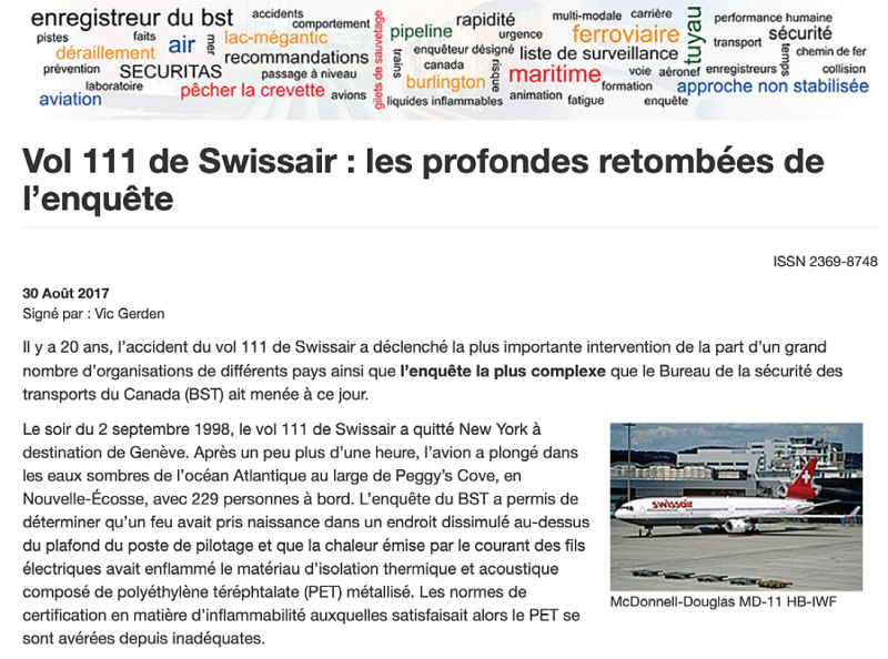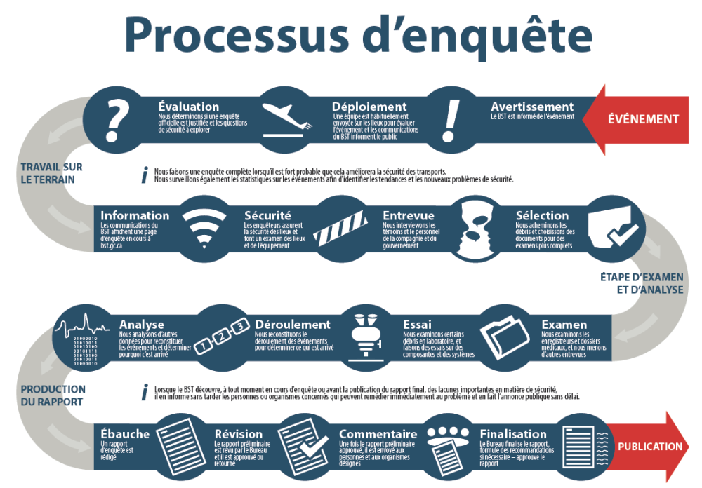 Les enquêteurs et le personnel technique chevronnés du BST évaluent les circonstances de ces événements. S'ils déterminent qu'une enquête pourrait servir à améliorer la sécurité des transports, ils recueillent des données et en font l'analyse pour déterminer les causes et les facteurs contributifs, et soulignent les préoccupations connues et nouvelles qui sont liées à la sécurité. Depuis 1990, ces efforts ont permis au système de transport canadien d'asseoir sa réputation comme l'un des plus sécuritaires au monde.