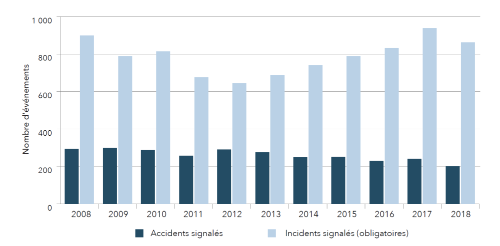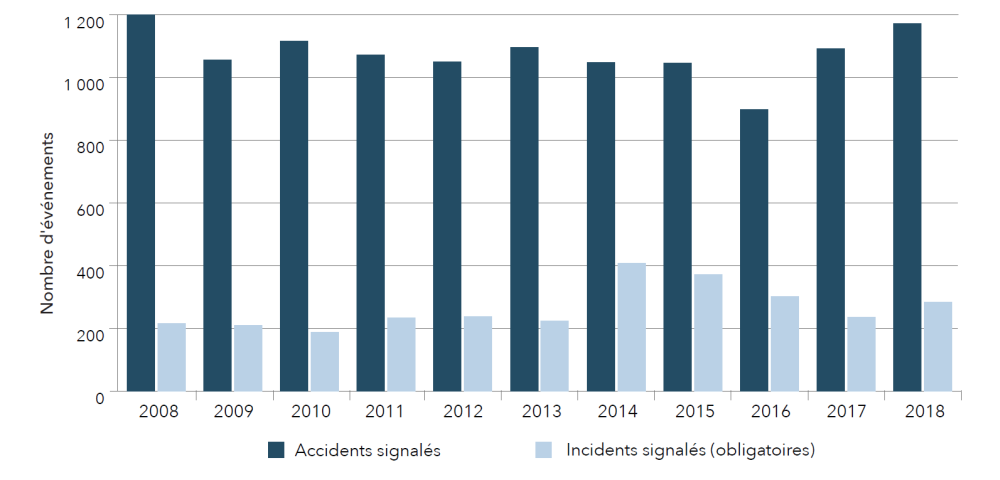 Après une tendance à la baisse de 2008 à 2016, le nombre global d'accidents signalés en 2018 (1657) a été supérieur de 2,5 % au niveau de 2017 (1615), et tout juste supérieur à la moyenne décennale de 1648.