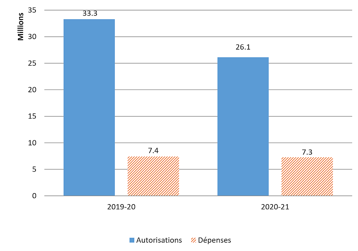 Le montant total des autorisations pour utilisation du BST a diminué de 7,2 millions de dollars entre les exercices 2020-2021 et 2019-2020 en raison d’une baisse des crédits au Budget principal des dépenses. En raison de la pandémie de COVID-19 et des restrictions aux sessions au printemps pour que le Parlement puisse étudier les crédits, le Règlement de la Chambre des communes a été modifié pour prolonger la période d’étude jusqu’à l’automne. Cela signifie que les autorisations disponibles pour utilisation dont fait état le présent rapport ne représentent que 75 % des crédits accordés au BST dans le Budget principal des dépenses et ne sont donc pas comparables à celles de l’année précédente pour lesquelles le montant total des crédits avait été obtenu. Le BST devrait recevoir la totalité des crédits prévus au Budget principal des dépenses 2020-2021 en décembre 2020.