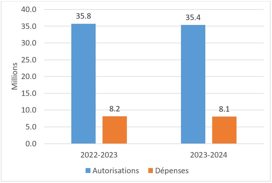 Le montant total des autorisations disponibles pour utilisation du BST ont diminué de 379 000 dollars entre les exercices financiers 2023-2024 et 2022-2023. Cette variation s'explique principalement par le financement de 615 000 dollars reçu en lien avec le programme de Laboratoires Canada en 2022-2023, mais qui n'a pas été reçu pour l'exercice financier en cours. Pour 2023-2024, une nouvelle structure de financement a été convenue, selon laquelle la BST ne recevrait pas d'autorisations initiales pour le programme de Laboratoires Canada, mais plutôt un remboursement des dépenses engagées. Cette diminution est compensée par une augmentation de 167 000 dollars attribuable au rajustement de la rémunération associée au renouvellement des conventions collectives ainsi qu’un rajustement au taux prévu pour le régime d’avantages sociaux des employés (RASE). Ce taux fluctue d’une année à l’autre et est fixé annuellement par le Secrétariat du Conseil du Trésor.