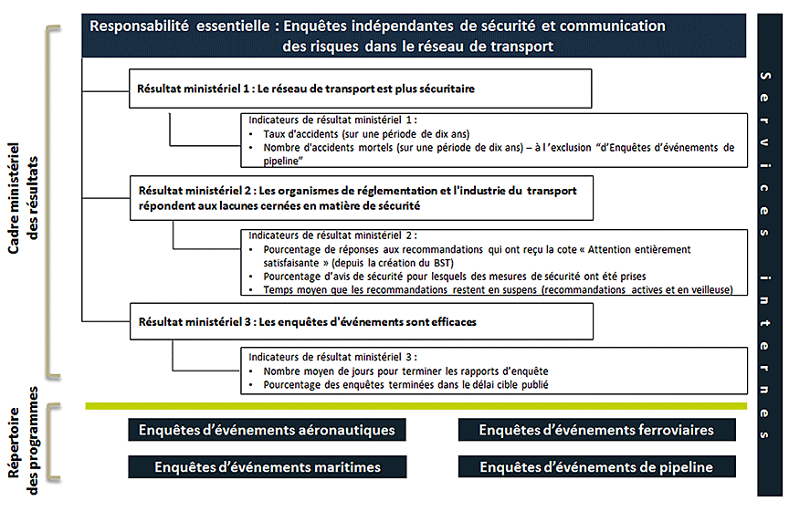 L’unique objectif du BST consiste à promouvoir la sécurité du transport aérien, maritime, ferroviaire et par pipeline. Le BST dispose des quatre programmes clés suivants à l’appui de la responsabilité essentielle :