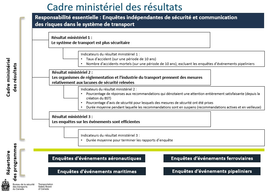 Le Cadre ministériel des résultats et le Répertoire des programmes officiels du BST pour 2021-2022 sont présentés ci-dessous.