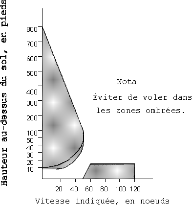 Le graphique de la hauteur en fonction de la vitesse (courbe H/V) montre le rapport entre la hauteur au-dessus du sol et la vitesse en translation, y compris le vol stationnaire, pour lequel un atterrissage peut être effectué en toute sécurité advenant une perte de puissance ou une perte de maîtrise en direction (situations critiques).