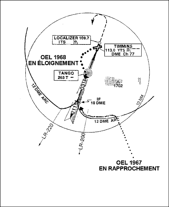 Lorsque le vol OEL 1968 a circulé sur la piste en vue du décollage sur la piste 21, les vents soufflaient toujours de l'ouest, mais avaient augmenté à 10 noeuds avec des rafales pouvant atteindre 20 noeuds. L'équipage a avisé la FSS de Timmins qu'il décollerait de la piste 28. Le changement de piste pour le décollage du vol OEL 1968 a été transmis au contrôleur de l'ACC qui l'a approuvé à 10 h 22. Après avoir confirmé avec l'équipage du vol OEL 1967 que cet équipage prévoyait effectuer une approche ILS de la piste 03 et avoir avisé cet équipage qu'un aéronef de la compagnie décollait, le contrôleur de l'ACC a accordé au vol OEL 1968 l'autorisation de décoller à 10 h 25. Au moment où le vol OEL 1967 arrivait à 5 000 pieds-mer, le contrôleur de l'ACC a demandé à l'équipage s'il prévoyait effectuer une approche en arc de la piste 03 ou se diriger directement vers le VOR. L'équipage du vol OEL 1967 a répondu qu'il prévoyait effectuer une approche en arc et a obtenu l'autorisation d'effectuer une approche en arc à 12 DME (équipement de mesure de distance). Lorsque le vol OEL 1967 a signalé qu'il se trouvait à 12 DME, le contrôleur de l'ACC a avisé le vol OEL 1967 que le vol OEL 1968 décollait et lui a demandé de le rappeler lorsqu'il se trouverait sur le radial de référence, soit le radial 200 du VOR de Timmins. Le vol OEL 1967 a signalé sa position au radial de référence à 10 h 31 et, lorsque le contrôleur de l'ACC le lui a demandé, le vol OEL 1968 a signalé qu'il se trouvait à 4 000 pieds-mer au radial 210 en éloignement à 5,5 DME. À 10 h 32, le contrôleur de l'ACC a autorisé le vol OEL 1967 à effectuer une approche ILS directe de la piste 03 et a également autorisé le vol OEL 1968 à monter à 17 000 pieds-mer. Les aéronefs se dirigeaient l'un vers l'autre, dans les nuages, et se rapprochaient lorsque leur système TCAS respectif les a avertis du risque de collision imminent.
