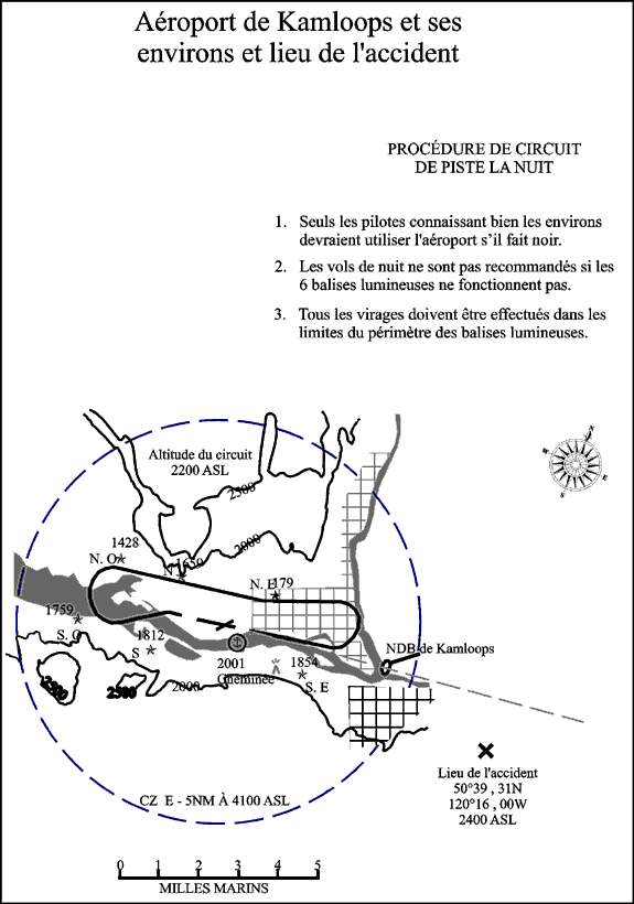 - L'aéroport de Kamloops est entouré d'un relief montagneux sur tous les côtés, et des mises en garde avaient été publiées au sujet de l'utilisation de l'aéroport en vol VFR la nuit.