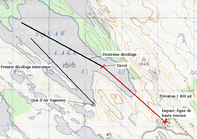 Le lac de la Squaw est orienté nord-ouest/sud-est et mesure environ deux milles et demie de longueur (voir Annexe C). En direction sud-est, au bout du lac, il y a une vallée entre deux collines. L'élévation du lac est de 1 616 pieds au-dessus du niveau de la mer (asl), alors que l'élévation au premier point d'impact de l'appareil est de 1 800 pieds asl. L'aéronef aurait parcouru environ 8 000 pieds avant de décoller et aurait volé sur une distance de 8 000 pieds avant l'impact au sol. Le pilote a déclaré qu'il s'était rendu compte que l'aéronef n'atteignait pas ses performances habituelles durant la montée initiale. Durant la course au décollage, l'aéronef a utilisé une distance plus longue que la normale avant de prendre son envol. Le pilote a attribué cette situation à un vent de dos. Normalement, une fois l'aéronef en vol, le pilote abaissait le nez de l'appareil pour rentrer les volets et laisser l'aéronef accélérer au meilleur taux de montée. Dans ce cas-ci, le pilote n'a pu rentrer les volets à cause du rivage et des obstacles qui se rapprochaient rapidement. Il a tiré sur les commandes et a essayé de prendre de l'altitude en maintenant une vitesse d'environ 80 mi/h alors que les volets étaient toujours abaissés à 15 degrés. Le pilote a essayé de passer par-dessus les obstacles situés sur sa trajectoire de vol mais, lorsque les lignes à haute tension sont apparues devant, il n'a pu effectuer de manoeuvre d'évitement afin de franchir l'obstacle. L'aéronef a percuté les lignes à haute tension et un poteau de bois, puis a piqué du nez pour pivoter autour du poteau avant de s'écraser au sol. Un incendie d'une très forte intensité s'est déclaré après l'immobilisation de l'appareil au sol.