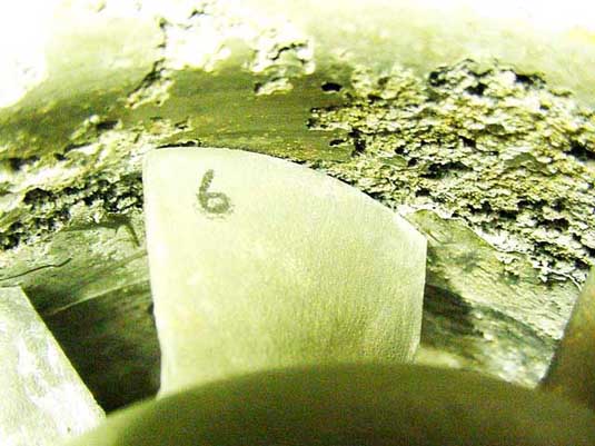 L'intérieur du carter du ventilateur, près de la voie de passage des aubes du ventilateur, était aussi gravement corrodé. Toutefois, aux endroits où le revêtement de surface avait résisté, on pouvait observer de légères marques de rotation.